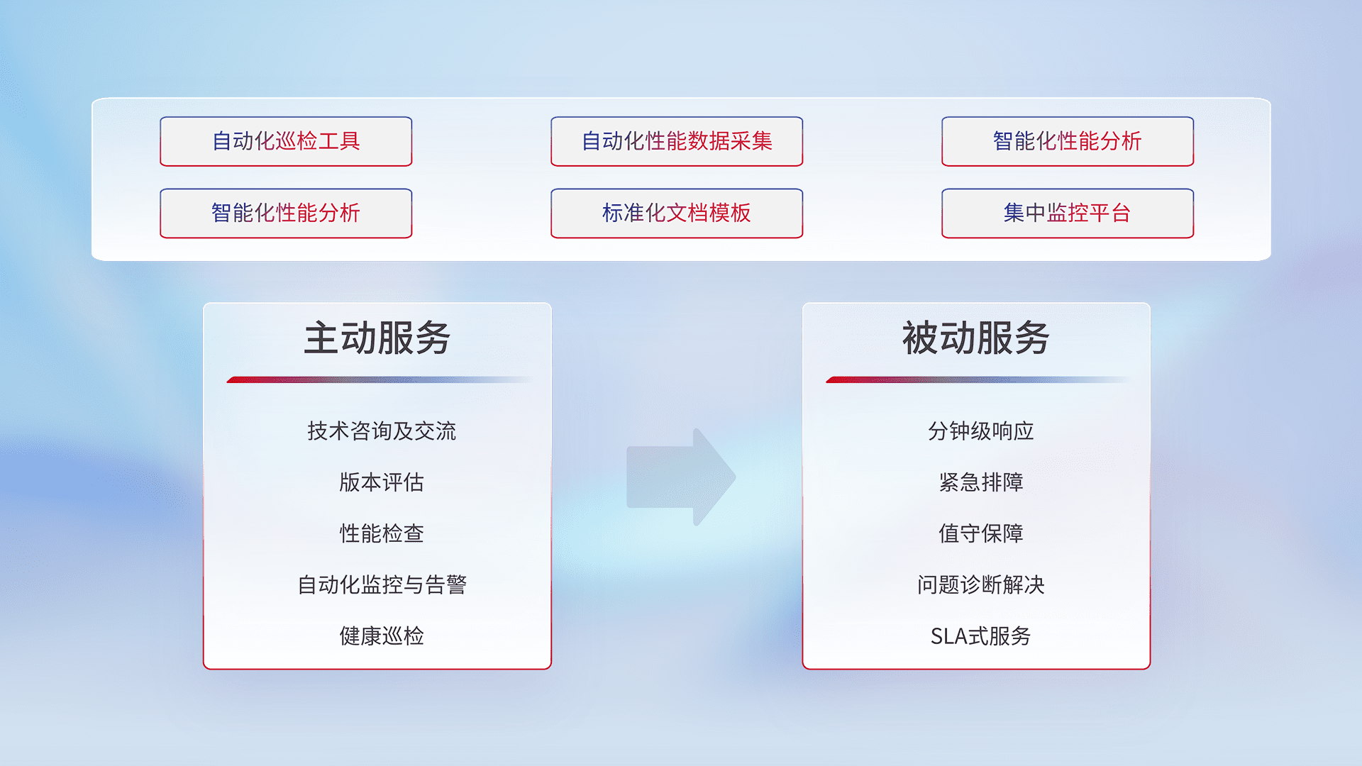 智能化工具和标准化文档,,,,保障服务质量,,提供主动服务(包含技术咨询、、、版本评估、、性能检查、、自动化监控与告警、、健康巡检)和被动服务包含(分钟级响应、、紧急排障、、、值守保障、、、问题诊断解决、、、SLA服务)。。